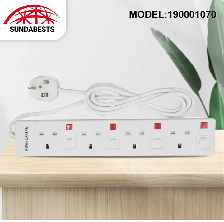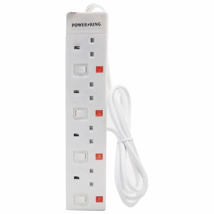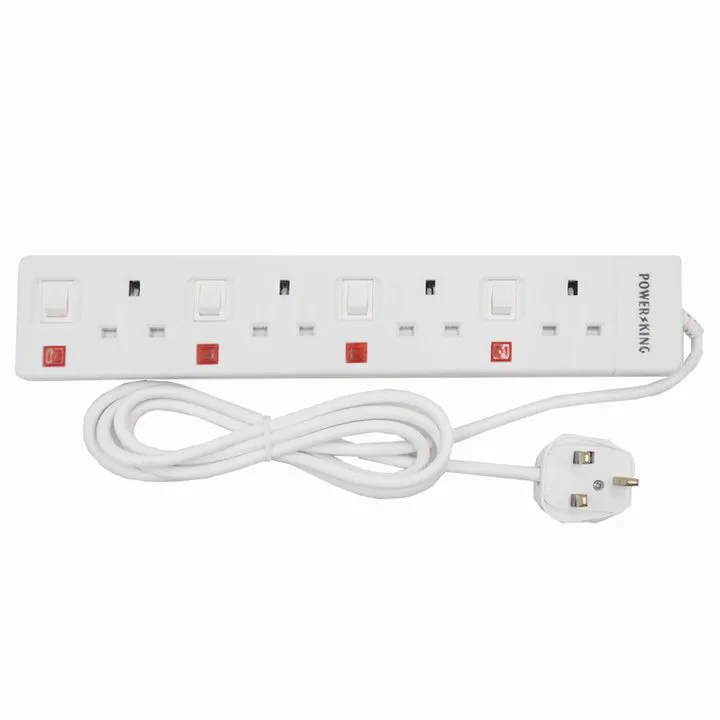 4-Way Power extension Socket Full copper wire-Heavy duty PVC cable and fire resistant material-Power indicator neon light-Voltage:220-240V/50Hz-Power: 1200W-With button-White-2 meters cable extension
